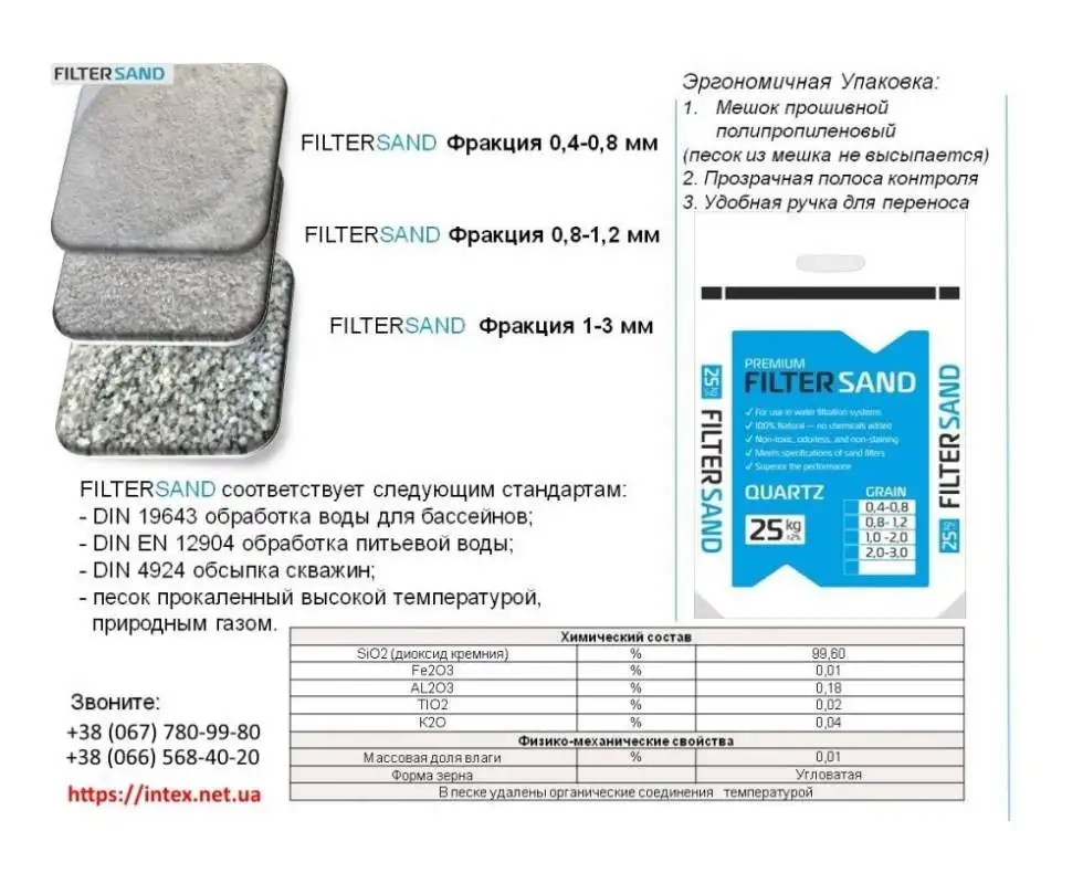 - FilterSand 0-4-0-8-25, пісок кварцовий для фільтрів басейнів. Фракція 0.4-0.8 мм, 25 кг