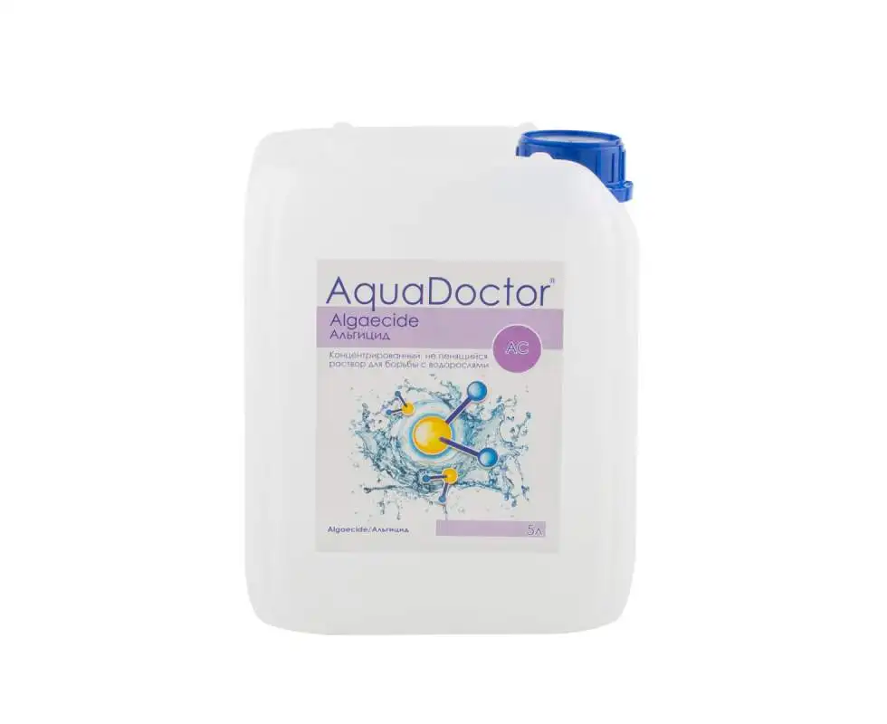 У відкритому басейні тепла вода є ідеальним середовищем для поширення водоростей і грибкових утворень. Хлорвмісні дезінфікуючі препарати не можуть повноцінно перешкоджати розростанню колоній водоростей – з цим завданням відмінно справляється альгіцид AquaDoctor AC. Представлений рідкий швидкорозчинний препарат розрахований на шокову і систематичну обробку води. Особливий хімічний склад AquaDoctor AC зробить басейн кристально чистим в найкоротші терміни.
